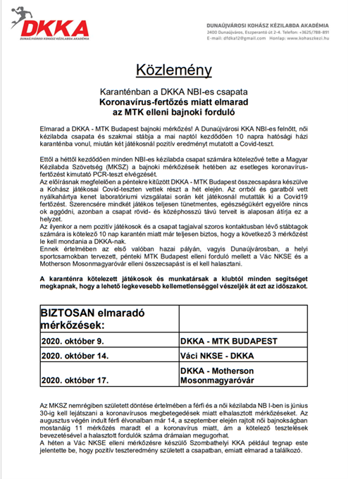 Vágó Attila, a DKKA vezetőedzője a héten megjelent interjújában azt mondta, attól tart, a kötelező tesztelés bevezetése után emelkedhet a pozitív esetek száma. Sajnos igaza lett, hiszen az első alkalom után a DKKA két játékosánál is pozitív lett a PCR-tesztelés eredménye. Így elmarad a DKKA péntekre tervezett hazai bajnoki mérkőzése az MTK ellen. A teljes csapat és a szakmai stáb csütörtöktől tíz napra hatósági házi karanténba került, így a jövő heti mérkőzéseiket sem tudják lejátszani.